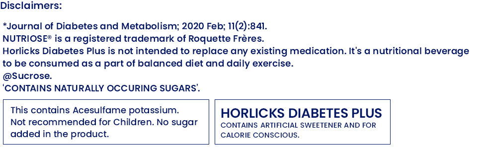 Horlicks Diabetes Plus is a nutritional beverage which has been designed for Indian adults. It contains Dual blend high fibre~ - Fibersol-2 and Nutriose®. These fibres are known to promote satiety and reduce calorie intake. Research has shown that diet rich in fibre helps reduce glucose and lipids in blood*. It is high in protein and contains 16 vital nutrients. NUTRIOSE® is a registered trademark of Roquette Frères NUTRIOSE® and Fibersol -2 are trade names for Wheat fibre dextrin & Corn fibre dextrin respectively. Horlicks Diabetes Plus is not intended to replace any existing medication. It is a nutritional beverage to be consumed as a part of balanced daily diet and exercise.